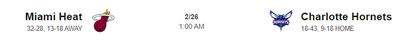 - Miami Heat (32-28, hetedik a keleti konferenciában) vs. Charlotte Hornets (18-43, 14. a keleti konferenciában)