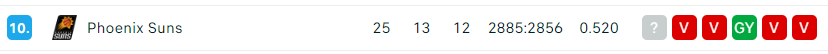 - A szezon elején a Sunsot tartották a bajnoki gyűrű egyik fő esélyesének, és a nyugati bajnokság egyik fő esélyesének. Azonban nagyon hullámzóan játszanak, aminek köszönhetően 13-12-es mérleggel állnak, ami csak a tizedik helyre elég nyugaton. Sok meccs van még hátra, és a Sunsnak még bőven van ideje arra, hogy megfordítsa a szezont és lassan javítson. Talán ez a Wizards elleni meccs lesz a kezdete egy jó eredménysorozatnak. Végre együtt debütált a Sunsnál a Durant - Booker - Beal trió, akiknek az arizonai csapat feltűnő erejét kellett volna jelenteniük. Mindössze két meccset játszottak együtt, és mindkettőn hazai pályán szenvedtek vereséget. Előbb a Brooklyn, majd a New York ellen kaptak ki. A New York elleni utolsó meccset igyekeznek majd minél hamarabb elfelejteni, hiszen talán a legrosszabb meccsüket játszották ebben a szezonban, 139 pontot is kaptak, és meggyőző vereséget szenvedtek. A Sunsban hatalmas támadó potenciál van, de a Phoenixnek elsősorban védekezésben kell növelnie az intenzitást. Durant 30,7 pontot átlagol, míg Booker 28,1 pontot átlagol. Kettejük és a csapat többi tagja között óriási az egyensúlyhiány. Az utóbbi meccseken nagyban hozzájárult hozzájuk Jusuf Nurkic extra formája.
