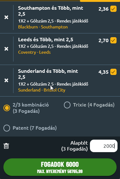 - Ha pedig mindhárom meccsbe beletrafálunk, akkor három 4-szeres nyereményünk lesz (2,0-val számolva), ami a feltett 3000 forint tétre 12.000 forintot jelent.