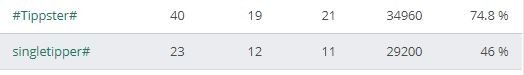 A második helyen singletipper# végzett 23 leadott tippjéből 12 lejött, a ROI pedig 46% lett.