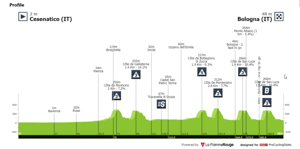 - A 199,2 kilométeres szakasz Marco Pantani szülőhelyéről, Cesenaticóból indul és Bolognában ér véget. Ezen a szakaszon már az összetett menők is tesztelhetik egymást. A szakasz a tengerszintről indul az Adriai-tenger partján, majd észak felé halad a bizánci Ravennába, majd nyugatra Imolába, ahol az Enzo és Dino autóversenypályán egy kört tesz meg. Rövid, de meredek emelkedőkkel van tarkítva, amelyek komoly versenyhelyzetet teremtenek majd. A San Luca emelkedő csak 1,9 km hosszú, de átlagosan 10,6%-kal emelkedik. Ideális helynek tűnik Pogačar számára, hogy igazán próbára tegye Vingegaardot és megmutassa valódi formáját. A 2. szakasz kétszer érinti a San Luca emelkedőt, 168 km után és 186 km után. A csúcstól a Bologna központjában lévő célvonalig mindössze 12,1 km gyors, próbára tevő lejtmenet és sík vár a mezőnyre.