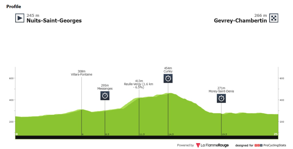 - Nuits-Saint-Georges-ból rajtol az 25,3 kilométeres időfutam, a befutó Gevrey-Chambertin-ben lesz. Az útvonal közepén egy domb helyezkedik el, amelyben 213 méterről 454-re kapaszkodnak fel pontosan 3 kilométer hosszan.