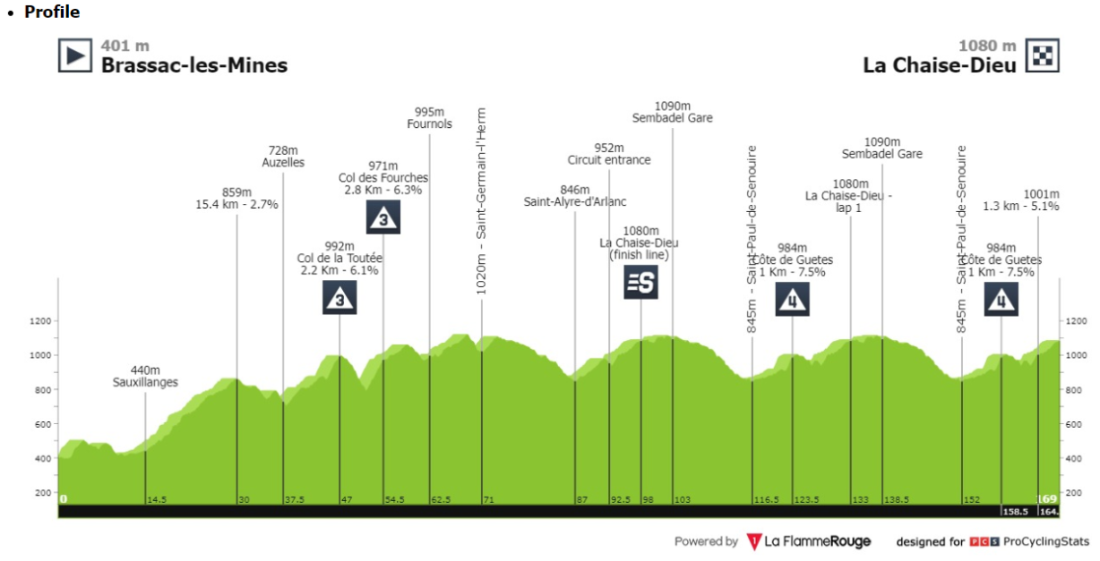 - Az első szakasz és a második szakasz, mintha édestestvérek lennének, csak kicsit máshogyan néznek ki. 167,3 km-es útvonal a Puy-de-Dôme-i Brassac-les-Mines-ból Haute-Loire-ba vezet, és La Chaise-Dieu-ben ér véget. Dombos menet lesz, két 4-es és két 3-as mászással, a Col de la Toutée (2,2 km, 6%-os) és a Col des Fourches (2,7 km, 6,5%-os) emelkedővel, majd a befutó előtt a 4-es kategóriájú hegy következik. Először a Côte des Guêtes (1 km, 8%-os) és a befutónál ismét ugyanez a hegy. Ez egy újabb esély a puncheur-ök számára. Vagyis azoknak az ún. egynapos specialistáknak, akik jól másznak a rövidebb, de meredekebb emelkedőkön, illetve jó a sprintjük és a tempómenésük is. Esetleg valamelyik összetettben érdekelt kerekes, mondjuk Vingegaard gondolhat egyet a hegyi befutón és megnyer