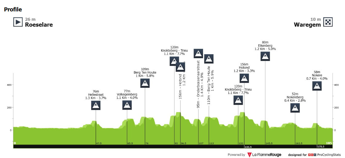 - A 2026-os verseny Roeselare-ból indul és Waregemben ér véget, összesen 184–185 km hosszú. Az első 50 km szinte teljesen sík, ami kedvez a korai szökéseknek. A nehézségek a Hellestraat emelkedővel kezdődnek, amely idén új elem a pályán. Ezt követik a klasszikus flamand emelkedők, a Volkegemberg, Berg Ten Houte (kétszer is), Knokteberg–Trieu (többször, ez a nap egyik legkeményebb emelkedője), Hotond, Eikenberg, Nokereberg (dupla kör a végén). A pálya 12 emelkedőt és 7 macskaköves szektort tartalmaz, köztük a Mariaborrestraatot. A verseny jellegzetessége, hogy a nehézségek fokozatosan halmozódnak, majd a végjátékban egyszerre szakítják szét a mezőnyt.