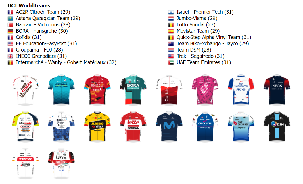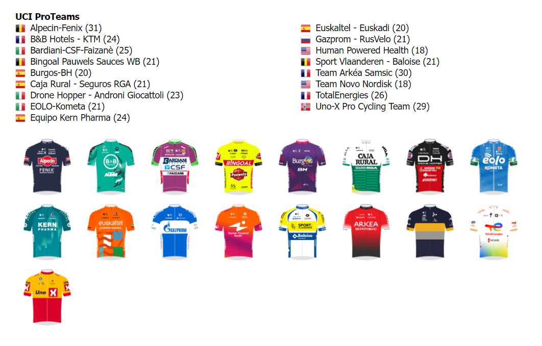 - A kerékpáros csapatok az UCI által rangsorolva vannak három csoportba. Ezek a rangsorok szabják meg, hogy milyen versenyekre tudnak elmenni. A legmagasabb kategória a WORLD TOUR csapatok. Ebből maximum 20 lehet. A protour-licencet azok a csapatok kapják, amelyek a legmagasabb szinten, komoly anyagi költségvetésből, dolgoznak. A licencre pályázni kell és az UCI dönt. A kisorolásról és a besorolásról is. PL: A Israel Start-Up Nation csapatát néhány éve alapította egy izraeli multimilliárdos, a csapat néhány év alatt eljutott a World Tourig. Mára már nagyon komoly versenyzőik vannak és eddig a napig 2021-ben 7 győzelmük van a legmagasabban kategorizált versenyekről. A Protour csapatokból idén 19 van. A leggazdagabb az Ineos Grenadiers és az UEA Team Emirates, ahol teker napjank legjobb összetett menője, a szlovén Tadej Pogacar is. A Protour-gárdák minden legfeldőbb kategóriás versenyekre alanyi jogon mennek, de nekik ez kötelező is!