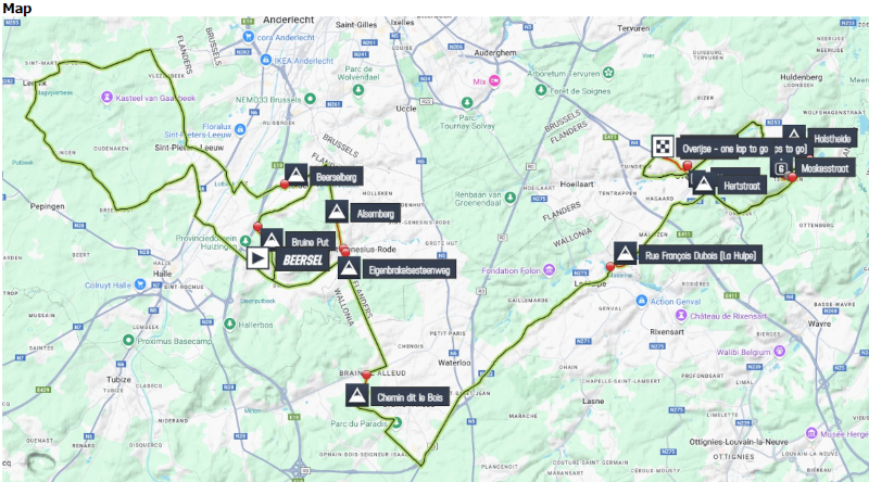 - A 2025-ös kiírás is hű marad a verseny szellemiségéhez: a mezőny Beersel városából rajtol, majd Overijse-ben ér véget, miután háromszor megtesznek egy dombos kört, amit a 2021-es világbajnokságon is használtak. Ezt követően jön a négy zárókör, mindegyik 19,8 km-es, és benne a verseny ikonikus négy emelkedőjével: Hertstraat, Moskesstraat, Holstheide és végül az S-bocht, amely nemcsak szűk és technikás, de egyben a befutó helyszíne is.
