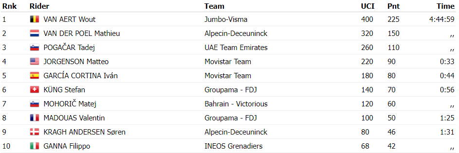 - Futamgyőztes: Matthieu van der Poel - 3,75 (Ő a legerősebb a három közül és ez a hosszú nehéz futam nagyon fekszik neki!)