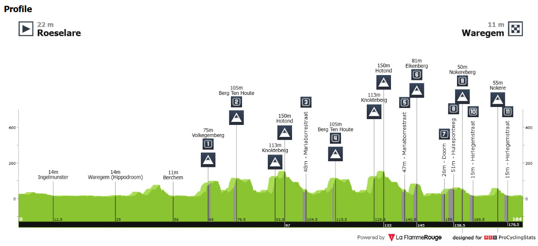 - Az útvonal Roeselare-ből indul és Waregemben ér véget, ahogy eddig is, de van változás tavalyhoz képest! A szervezők biztonsági okokból törölték a Kanarieberget, mivel a hozzá vezető szakasz túl veszélyesnek bizonyult, és tavaly komoly bukásokat okozott, többek között Wout van Aert, Jasper Stuyven és Biniam Girmay számára. A Varent macskaköves szektort szintén kivették az útvonalból, mert a versenyigazgató szerint nem jelentett hozzáadott értéket. A Kortekeer helyére a Berg Ten Houte második áthaladása került, míg a Ladeuze-t az Eikenberg váltja, amelyet 39 kilométerrel a cél előtt kell megmászni. A verseny viszonylag nyugodt kezdéssel indul, az első komoly emelkedő a Volkegemberg a 68. kilométernél, amely után a Holleweg macskaköves szakasz következik. A verseny legnehezebb része Maarkedal térségében kezdődik, ahol a mezőny kétszer is megmássza a Berg Ten Houte-t, valamint a Knokteberg-Trieu, Hotond és Mariaborrestraat szakaszokat. A célegyenes előtt a versenyzőknek még kétszer kell teljesíteniük a Nokereberget és a Herlegemstraat macskaköves szektort, amelyek hagyományosan döntő szerepet játszanak az eredmény alakulásában.