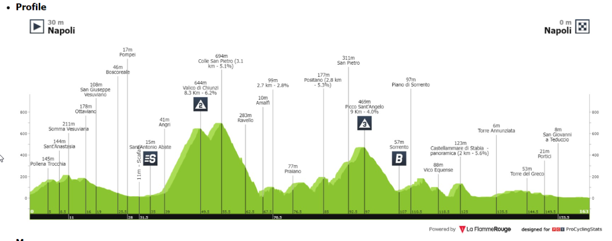 - Sajnos a tegnapi szakaszt nem láttam, így csak az eredményről tudok beszámolni. Kaden Grooves nyert és az a Jonathan Milan lett a második, aki a második szakaszon nyerni tudott, így rajta feszül a pontversenyben vezető keresnek járó Maglia Ciklamino, vagyis a ciklámen mez. Ez a mai szakasz 2800 szintemelkedést tartalmaz és 162 kilométer hosszú. Egy 2-es kategóriás és egy 3-as kategóriás hegy van benne, inkább erős közepes, mint nehéz. Viszont gyönyörű tájakon megy keresztül! Somma Vesuviana, Pompei, a Chiunzi-hágó, Amalfi, Positano, Capo di Mondo, Sorrento, Castellammare di Stabia, Torre Annunziata, Torre del Greco, Portici és ismét Nápoly. Az egész szakasz hullámos, számtalan kanyarral. A mezőny először a Vezúv körül tesz egy kört, majd a Valico di Chiunzi után az útvonal eléri a tengerpartot, és egészen Sorrentóig követi az Amalfi-partot. Az utolsó kilométerek városi utakon haladnak, több lakott területen áthaladva érik el Nápolyt, ahol az utolsó 3 km sík egészen a Via Caracciolóig, ahol a befutó lesz.