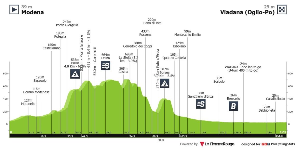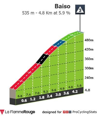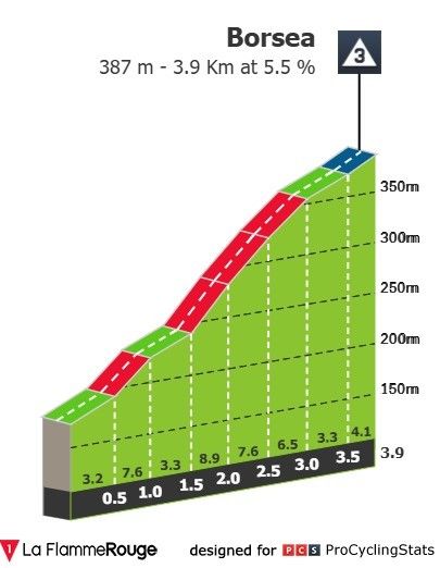 - Útvonal: Két kategorizált emelkedő vár a versenyzőkre ma, a Baiso után sokáig magaslaton járnak, de van benn sík rész is, semmi extra, a lejtő után irány egyből a másik harmadik kategóriás, Borsea, ez rövidebb és kevésbé meredek. Annyira a szakasz "elején" vannak, hogy bőven lesz idő összeállni a csapatoknak a teljes mezőnyhajrára és sprintre. Az egyetlen kérdés, hogy a Red Bull kapunál próbálkozik valaki az összetettből vagy semmi izgalom nem történik? 30 kilométerrel a szakasz vége előtt átlépik a célvonalat, majd egy teljes kör megtétele után zárul a nap. Teljesen sík a terep, az egyetlen említésre méltó dolog egy kanyar 500 méterrel a vége előtt, 8 méter széles aszfalton lesz a befutó, egyértelmű sprinter etap.