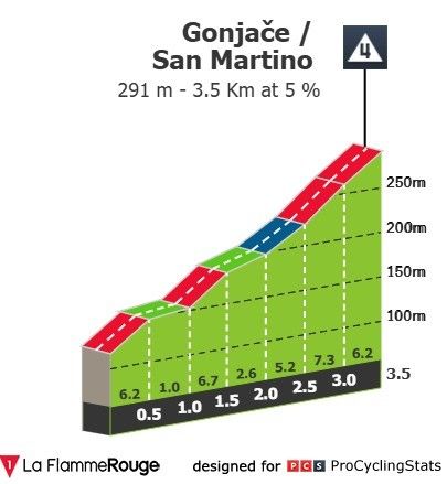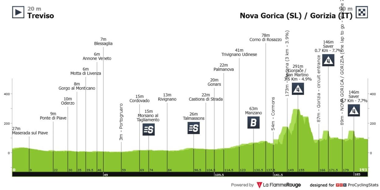 - Útvonal: Szlovéniában lesz a befutó, minden adott ma is a sprintbefutóra, ám ez a szakasz jobban fekszik a sík sprinterek, nem úgy, mint a tegnapi meredek hajrá. A terep nagy része sík, 130 kilométernél jön a Red Bull kapu, majd a Gonjace és Saver mászás, utóbbit kétszer érintik a bringások. Negyedik kategóriás emelkedők, semmi extra nincs bennük, jöhet a nagy csoportos mezőnyhajrá. A Saver után több kanyar, körforgalom jön, technikás a vége.