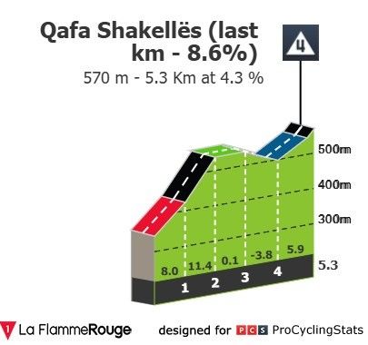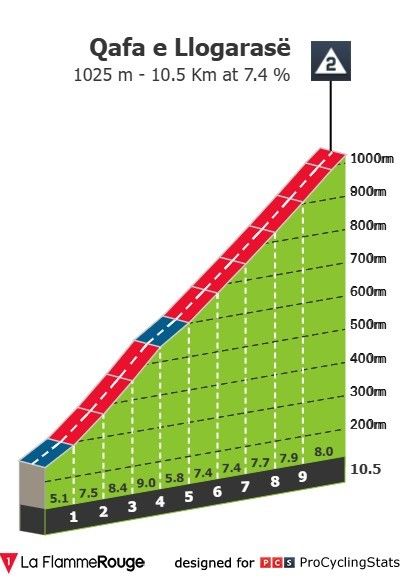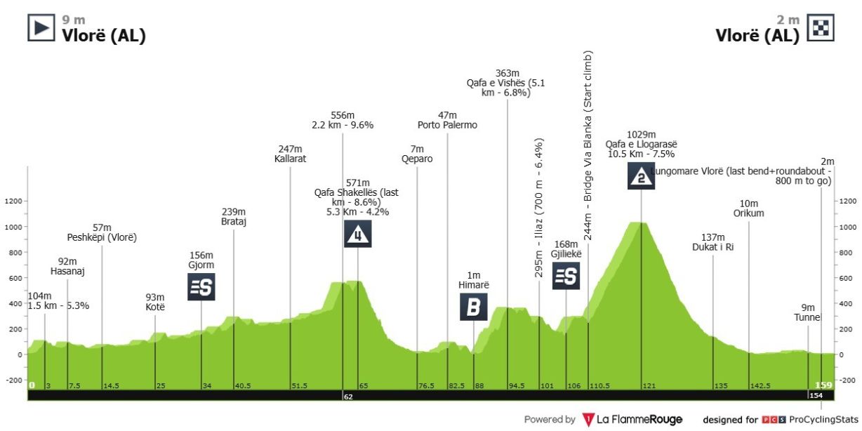 Emelkedők: A Qafa Shakelles átlag 4,3%-os, mert van benn lejtős rész, de az a 11,4-es kilométeres etap combos lesz, az utolsó kilómétert is külön kiemelik. Az őrület a Llogarasen lesz, hosszú, 1025 méterre kell felmenni és szinte végig tartja a 7.0% feletti meredekséget. Megváltás lesz feljutni a csúcsra és onnéttól jöhet a lejtmenet és az egyenes. Van egy kategorizálatlan rész is a Llogarase előtt, a Vishes, ami 5,1 km hosszú 6,8%-on, ez a hangoló mászás a Llogarasere.