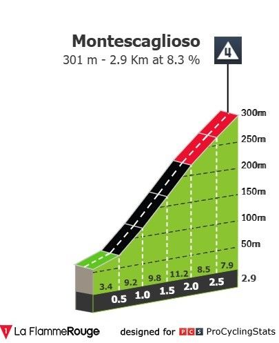 Emelkedők: A Montescaglioso első fele elég combos, viszont a 2,9 km táv nem túl hosszú. Megdolgozza a lábakat, így a befutón csak a legerősebbeknek lesz majd esélye.