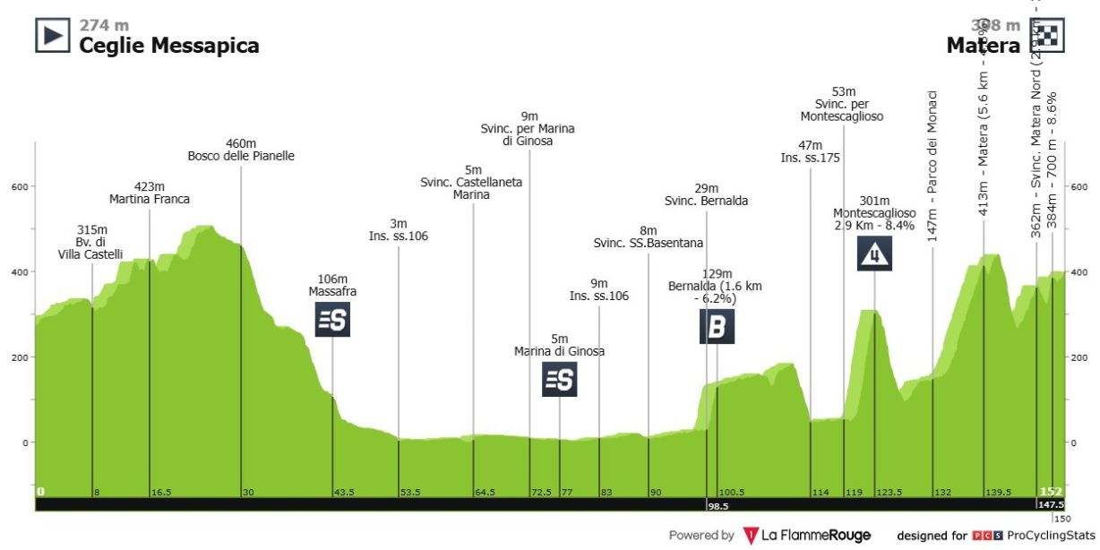 - Útvonal: A kép alapján ijesztőnek tűnik a szakasz, nem tetszik ez a grafika, a hivatalos oldalon sokkal élethűbb és nem ilyen félelmetes. A szakasz második felében lesznek mászások, ebből egy kategorizált emelkedő van, a Montescaglioso, az is 4-es besorolású. A terep ezután sem lesz egyszerű, lesz meredekség és kell az erő a lábakba. Hasonló lesz az albán napokhoz, aki "túléli", összecsaphat a többiekkel a mezőnyhajrá során.