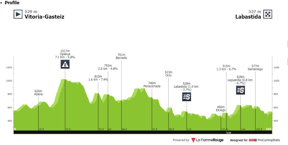 - A 165,4 kilométeres távval ez egy viszonylag rövid szakasz, ahogy az Baszkföldön általában lenni szokott, a régió fővárosából, Vitoria-Gasteizből Labastidába vezet, mindkettő a régió déli részén, a jól ismert és viszonylag sík fennsíkon található. Az elején egy közepes-, Kékes-szintű hegy, majd utána végig hullámzik. Szokás szerint nem hosszú a szakasz, de annál intenzívebb. Itt már az eleje óta kemény menés van, a kimenetel pedig mindig kérdéses. Az első nap 2500 méter emelkedővel, de viszonylag könnyű fináléval a gyors versenyzőknek egy enyhén emelkedős célban kell majd megküzdeniük a sárga trikóért.