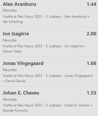 - El kell kezdenie az esélyeseknek nyerni. Ennek megfelelően ma a taktika a fárasztás lesz és azt gondolom, hogy az utolsó emelkedőre összeáll az a csoport, ahonnan valamelyik összetett menő nyerni fog. Persze a bukik Jonas Vingegaard-t várják, hogy nyerjen, ő a legerősebb csapat legerősebb kapitánya, de nem vagyok benne annyira biztos. Nekik ez a verseny inkább edzésjellegű, de persze számít az eredmény is.