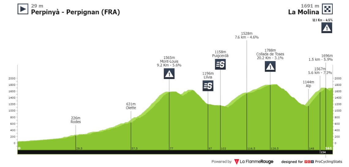 - Az első két szakasz sprintbefutó volt, eléggé megjósolhatatlan, ráadásul nem sík sprint, hanem kicsit emelkedős. Ez pedig még inkább megbolondítja a jóslást. A mai szakasz viszont már kemény, bár még messze nem a legkeményebb hegyi etap. A vége a La Molina tetején van, 1691 méter magasan, összesen három 1-es besorolású mászás vár a mezőnyre. Az elmúlt években, aki a La Molina után vezette az összetettet az meg is nyerte a végén a versenyt.