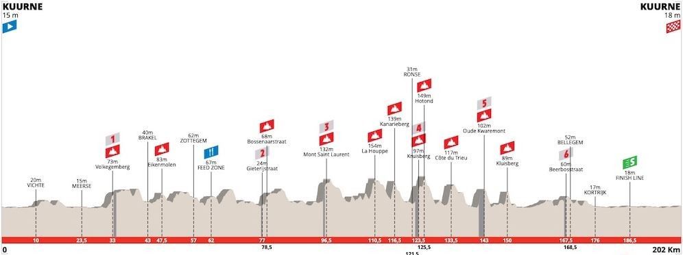 - Kuurne városából indulnak, áthaladnak a fővároson, majd visszakanyarodnak Kuurne-ig.