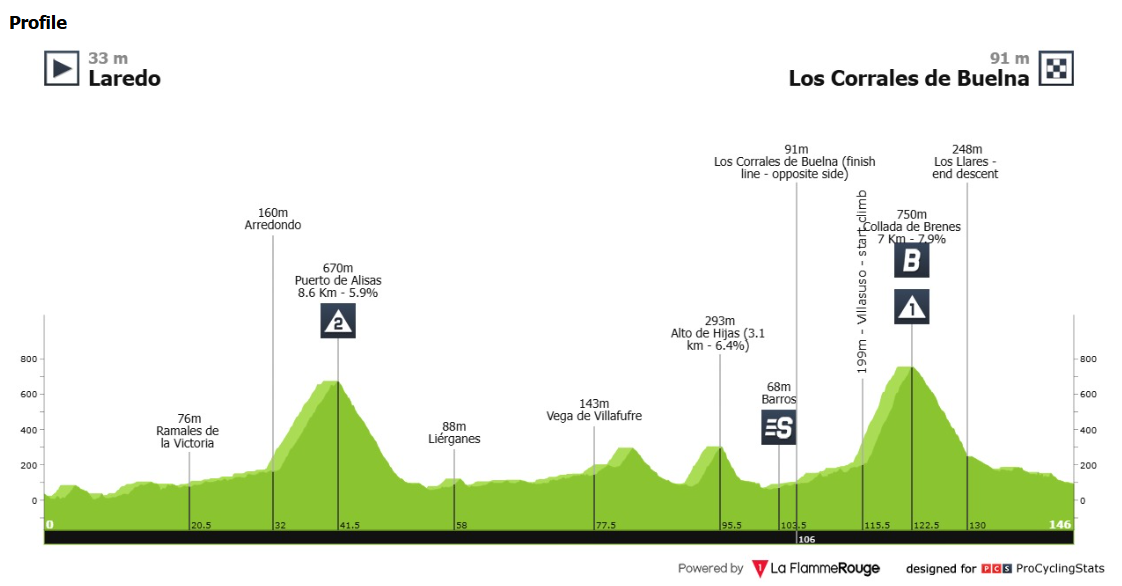 - Laredóból indulnak, majd 32 km bevezető után jön is a nap első komoly emelkedője az Alto de Alisas, amely 8,6 km hosszú és átlagosan 5,8%-os meredekségű. Ezt követően a mezőny kisebb dombokon halad át, míg elérik az Alto de Hijas nevű kaptatót, amely 3,6 km hosszú 6,9%-os átlagos emelkedéssel. A legnehezebb pont a Collada de Brenes, egy 7 km-es emelkedő, amely 7,9%-os átlagos meredekséggel bír, és két kilométeren keresztül kétszámjegyű meredekséget is elér. Ez az utolsó komoly hegy, amely után még 22,9 km van hátra a célig, enyhén lejtős terepen Los Corrales de Buelnáig.