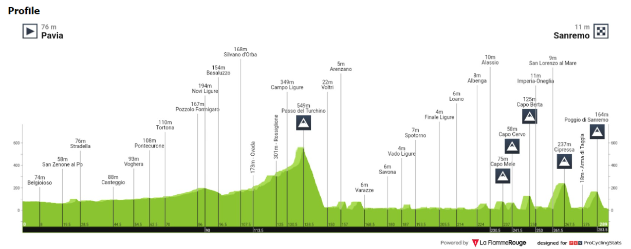 - A verseny Paviából indul, hogy aztán a Passo del Turcino (Turcino hágó) megmászása után leguruljanak a csodálatos Ligur tengerpartra, ahol Sanremóban lesz a cél. Ennek a viadalnak a nehézsége elsődlegesen a hosszában rejlik! 288 kilométert letekerni, a közepén egy 550 méteres (ezen a szinten közepesnek minősíthető) heggyel, még akkor is komoly feladat, ha profi kerékpárosokról van szó. Mire lenyomják a hat órát átlagosan több mint 40 km/h-ás átlaggal már úgy elsavasodnak, elfáradnak, hogy nem marad arra erő, hogy legyűrjék a menet végén található öt kisebb emelkedőt (Capo Mele, Capo Cerco, Capo Berta és főleg a két utolsó: Cipressa és Poggio), majd a végén sprinteljenek egyet Sanremóban. Az erő beosztása a lényeg és az időzítés!
