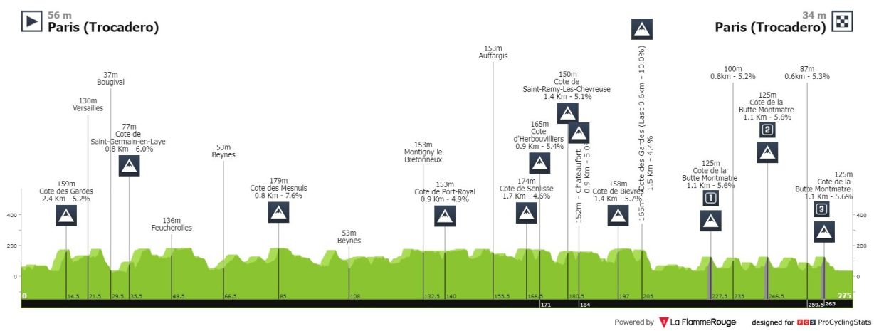 - A szintrajzból is látni, a pálya olyan lesz, mint a fűrész, tele rengeteg apró foggal. Egész nap a föl-le, föl-le ritmus a jellemző, ha átlagot akarunk vonni, 1-1,5 kilométer körüli gyors mászások, 5-6%-os emelkedőkön, de ebből iszonyat mennyiség. Összesen 2800 méter szintkülönbség lesz a lábakban. 273 kilométer a táv, melynek utolsó 54-55 kilométere egy párizsi körözés, kezdve Louvre látogatással. Ezután háromszor másszák meg a Montmartre dombot, ami a város legmagasabb pontja (130 méterrel a tengerszint felett). Na itt aztán lehet gyönyörködni a Sacre Coeur bazilikában, miközben morzsolják az imákat, ugyanis a Rue Lepic (ebben az utcában élt egy időben Van Gogh) nevéhez méltóan (Louis Lepic a napóleoni háborúk lovassági parancsnoka volt, előtte a Császár Útjának is nevezték a "Lepic utat") nem fog kegyelmezni a bringásoknak, a veszély kockakövek formájában érkezik, ami kirázza a lelket is a versenyzőkből. A történet ott végződik, ahol elkezdődött, irány vissza a Trocadero.