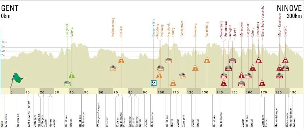 - Belgiumban ilyenkor még nagyon hideg van. A kerékpársport történelmében nem egy Omloop-verseny maradt már el a kegyetlen időjárás miatt. Mindezek mellett kőkemény, hosszú és kemény verseny várható, amelyet kilenc rövid-, ám meredek emelkedő, úgynevezett „fal”, valamint 13 kockaköves szektor nehezít. Ahhoz, hogy megérezzük, miért is nehéz ez, érdemes kipróbálni mondjuk Szentendrén, a művelődési ház előtti útszakaszon, milyen érzés végigmenni 20-szal a kockaköveken! A belga pavés részek nagyobb és kiemelkedőbb kövekből állnak és hozzávetőlegesen 40-nel mennek rajta végig.
