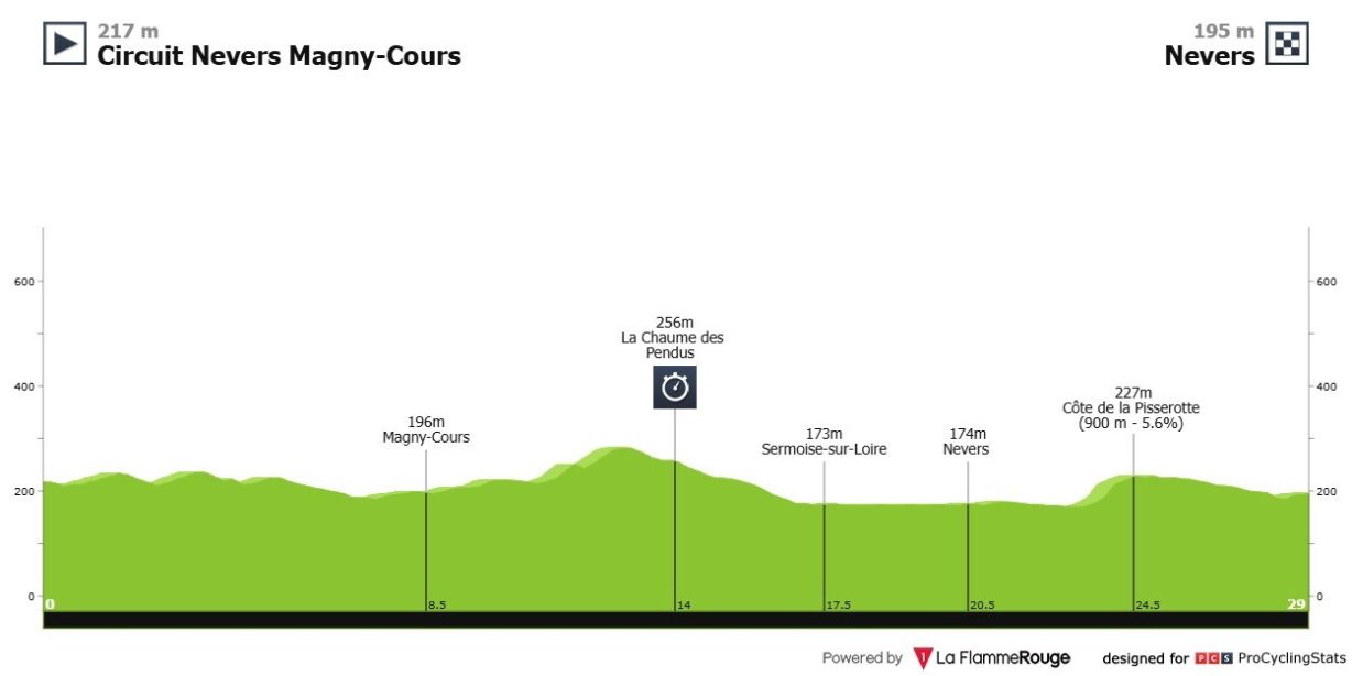 - Kalandos csapatidőfutam pályának ígérkezik, a dimbes-dombos útvonal ad neki egy különös pikantériát. Érdekes, hogy a verseny folyamatosan tolódik délre, de ma is észak felé tekernek a kerékpárosok, majd a futam után utaznak lefelé. A rajt a híres Magny-Cours versenypályától indul, 14 kilométernél (17 perc körül) van az első mért pont (lejtmenetben), a végállomás Nevers városa.