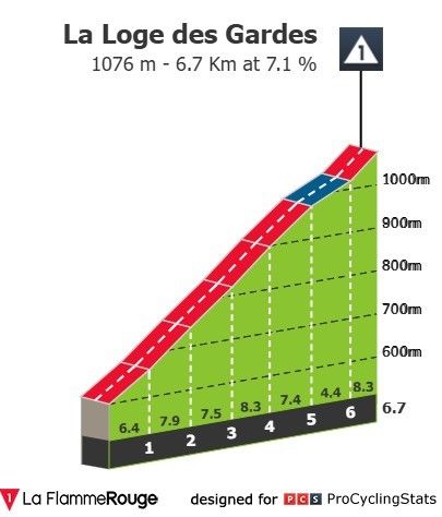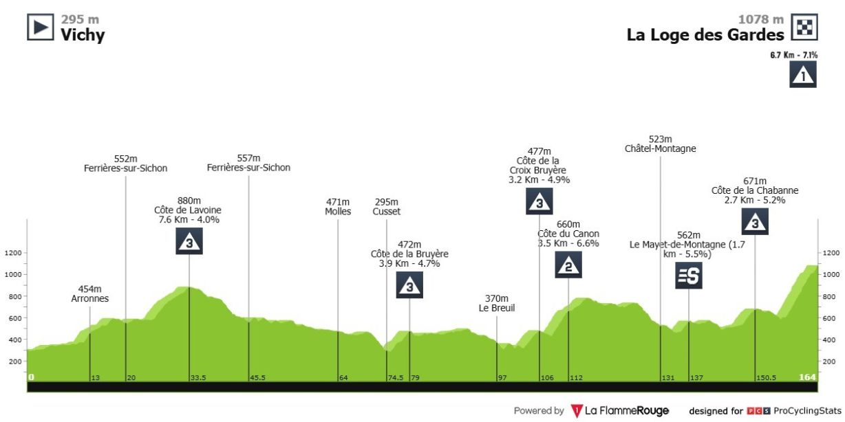 - Vége a gyerekjátéknak, innétől indul az igazi tűzijáték. 6 kategorizált emelkedő lesz, melynek nagy része harmadik kategóriás, de a nap végén a La Loge des Gardesen lesz a befutó, 1000 méter fölött. Kacskaringós útvonal jön, irány délre, majd vissza észak, majdnem visszamennek Vichybe, innéttől jön a kelet, majd nyugati irányzék és végül délkelet. A szélrózsa minden irányába tekernek. Három részre bonthatjuk a napot, picivel 100km után ér véget az első harmad, itt hosszabb, de kevésbé meredek mászások várnak a versenyzőkre. A Cote de la Croix Bruyere után szinte egyből jön a Cote du Canon, ez lesz a második rész nyitó része, innéttől jönnek a meredek, rövid emelkedők és egy részhajrá, végül a befutó a La Loge des Gardesen, 1078 méter magason. Íme a részletes ismertetője az utolsó emelkedőnek: