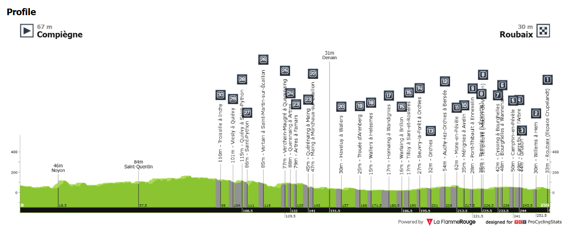 - A 2025-ös Paris-Roubaix férfi kerékpárverseny a verseny történetének 122. kiírása lesz, és április 13-án, vasárnap rendezik meg. A viadal ezúttal is a Compiègne városából indul, és a legendás roubaix-i velodromban ér célba. A táv összesen 259,2 kilométer, amelyből 55,3 kilométert tesznek ki a híres macskaköves szakaszok – szám szerint harminc ilyen lesz az idei kiadásban.