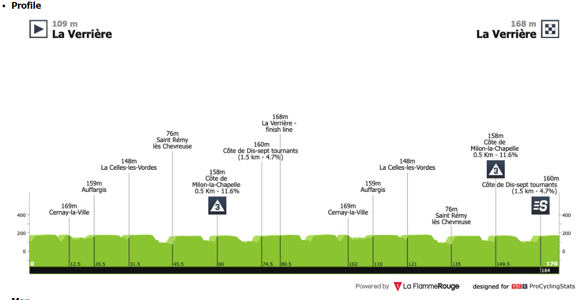 - Nem lesz mezőnyhajrá, hanem egy egynapos specialista ún. puncheur, aki jól sprintel, de ezeket a rövid meredekeket is bírja, fog majd nyerni. A szervezők idén megpróbálták lemásolni a tavalyi kiváló nyitány receptjét, ahol Jumbo igazi erődemonstrációval tudott nyerni. Idén La Verrière-t - Párizs délnyugati külvárosát - választották a szakasz központjának, amely a 89,7 km-es pálya két majdnem teljes köréből áll. Az első 10 km-t azonban kihagyják, így a teljes táv 169,4 km lesz, ami nagyon jellemző ezekre a nyitószakaszokra. A mai a nap egyetlen kategorizált emelkedőjét, a Cote de Milon-la-Chapelle-t (500 m, 12,0%), kétszer is meg fogják majd mászni. Hűvös időjárás 7 fok körüli hőmérséklet és idén túl nagy szél sem várható. A versenyt és minden szakaszt a Jumbo és az UAE fog irányítani, talán még az Ineos szólhat bele a küzdelembe.