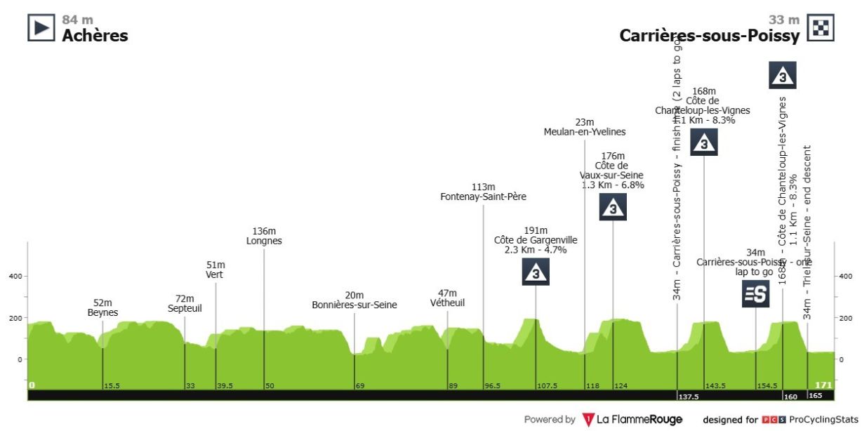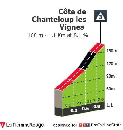 - Útvonal: Nem tűnik vészesnek a terep, de 2000 méter mászás csak vár a kerékpárosokra. Három kategorizált emelkedő az útvonalban, az utolsót kétszer másszák. Harmadik kategóriás mindegyik, a szakasz második felébe lettek bezsúfolva. 137 km-nél érintik a célvonalat, majd két és fél kört megtesznek a versenyzők és jön a befutó. A szakasz utolsó 6 kilométere sík, a sprinterek napja lehet, viszont a Cote de Chanteloup-les-Vignes pár embert ki fog szórni a mezőnyből. Niytószakasz, de már lesznek érdekességek.