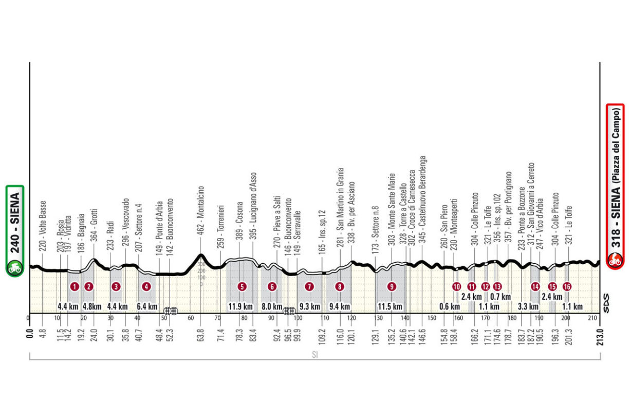 - Sienából indul a verseny és ide is tér végül vissza. 213 kilometer a táv, 82 kilométernyi murvás szakasszal (16 ilyen része lesz a pályának). A Straden nem kell keresni magas hegyeket és durva mászásokat, a legmagasabb pont 462 méteren lesz, Montalcino települést látogatják meg a dombtetőn. 4 kilométeres "mászás" átlag 5%-on. A versenyre inkább a meredek lejtmenetek jellemzőbbek, ami Pidcocknak kedvezni fog, mert imád lefelé száguldozni. A táv második felében jön a fűrészfog jelenség (folyamatos, apró fel-le-fel-le menetelés). Ha a térképet nézzük, két részre bontható a nap, Ponte d'Arbia a közös pont, kerékpársport rajongóknak ismert lehet a hurok fogalom. Miután elhagyják déli irányba az említett helyet, keletnek fordul a mezőny, majd vissza fel észak-nyugat irányzékkal visszatérnek Ponte d'Arbiaba és irány észak, Siena (jókora kitérőkkel), a kiinduló állomás közelében lesz a befutó. A cél felé indulást egy 30 kilométeres "körözés" előz meg, melynek során egy olyan helyszínt is érintenek, ami eddig még sosem szerepelt a Strade Bianche útvonalában (Strada del Castagno, 700 méternyi murvás szakasz). Az utolsó 3 kilométer sem lesz izgalom mentes, az alábbi elemekkel: pici emelkedő, lejtő, kockakő, éles jobb kanyar. Végállomás a Piazza del Campo.