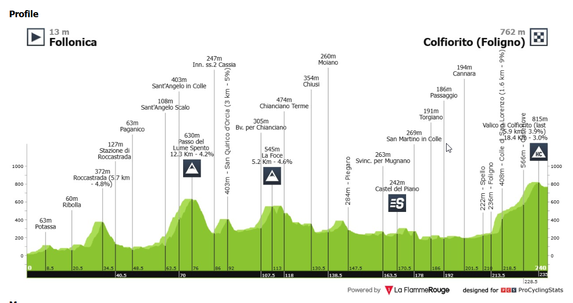 - Itt már iparkodni fognak az összetettben esélyes kapitányok és az egynapos erős emberek is! Különösen az utolsó 30 kilométer lesz a komoly csatározások helyszíne! Az utolsó kilométerek jelentős emelkedőket tartalmaznak. A legmeredekebb szakaszok az elején találhatók, ahol a lejtés meghaladja a 10%-ot is. Ezt egy hosszú, enyhén emelkedő szakasz követi, amely a Valicohoz vezet, majd egy rövid lejtmenet következik. Colfiorito központja után egy rövid, de meredek emelkedő visz el a célvonalig. Kétféle forgatókönyv létezik. Vagy a végén egy kisebb csoportba verődve a legerősebb kerekesek csatároznak a hegyen és egy jó lósszal valaki támad és megszerzi a győzelmet, vagy pedig egy kisebb csoport sprintel majd. Én az előbbire tippelek.