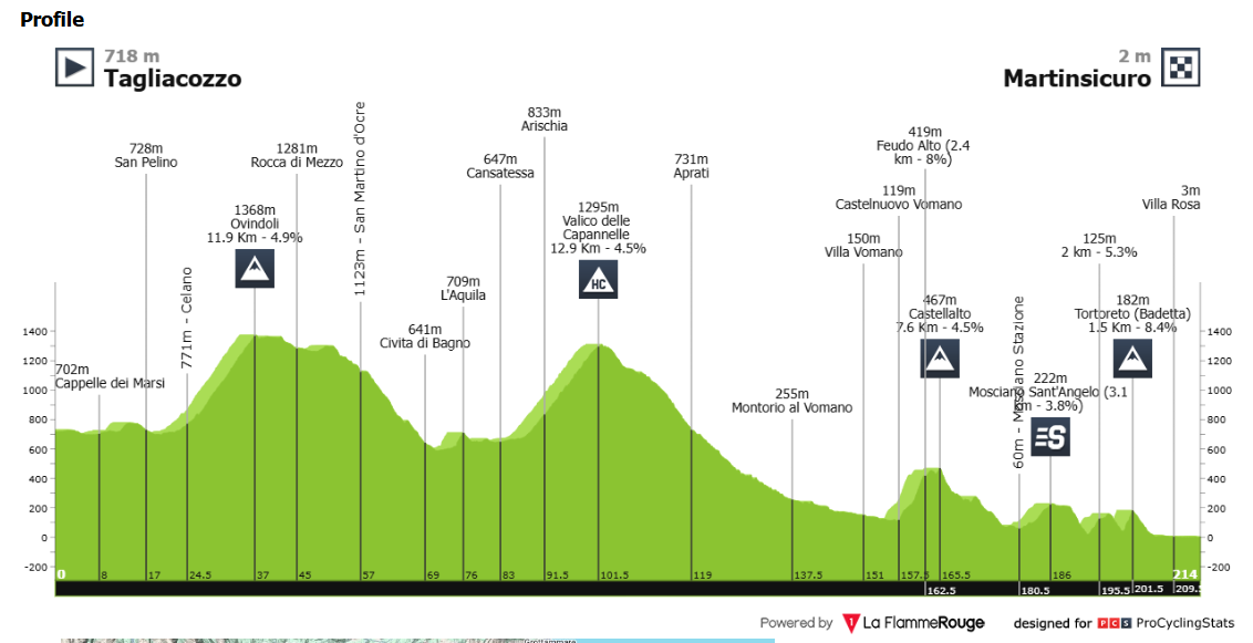 - A szakasz első 25 kilométere lényegében sík, egy enyhe emelkedéssel a 10. kilométer környékén. Ezt követi a 10,3 kilométeres, 5,6%-os emelkedő Ovindoli felé, majd kb. 15 kilométeren keresztül a versenyzők magasan haladnak. A lejtmenet L’Aquila felé után újabb 15 kilométer a völgyben zajlik.