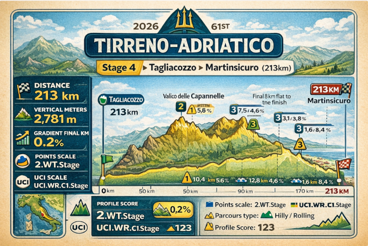 A Tirreno–Adriatico negyedik szakasza 210 kilométer hosszú, és összesen 2,500 méter szintemelkedést tartalmaz. A napot két nagyobb emelkedő uralja az első félidőben, majd négy kisebb kaptató következik a második részben. A záró, 1,6 kilométer hosszú, 8,4%-os emelkedőt követően az utolsó 8 kilométer már sík terepen vezet a célhoz. Lássuk részleteiben!