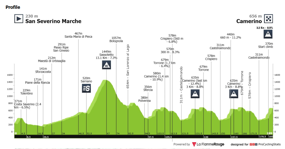 - A nap első felében egy hosszú hegyi próbatétellel, majd egy dombos körpályával. San Severino és Camerino között a versenyzők előbb egy nagy hurkot tesznek meg, mielőtt elérik a 13,1 kilométeres, átlagosan 7,4%-os Sassotetto-emelkedőt, ahol a meredekség helyenként 14%-ra nő. A hosszú lejtmenet után egy rövid, de harapós kaptató következik Camerino felé, majd 103,6 kilométer után a mezőny egy 29,1 kilométeres körpályára ér. Itt többször visszatérnek Camerinóba, minden körben két rövidebb emelkedő után, majd egy falsík szakaszt követően jön a meredek visszakapaszkodás. A záró emelkedő 3,2 kilométer hosszú és átlagban 8,9%-os, a legkeményebb részeken 18% fölötti meredekséggel. A rajt 10:35-kor lesz, a célba érkezést 15:40 körül várják, a 13 fokos, napos idő és gyenge szél mellett.