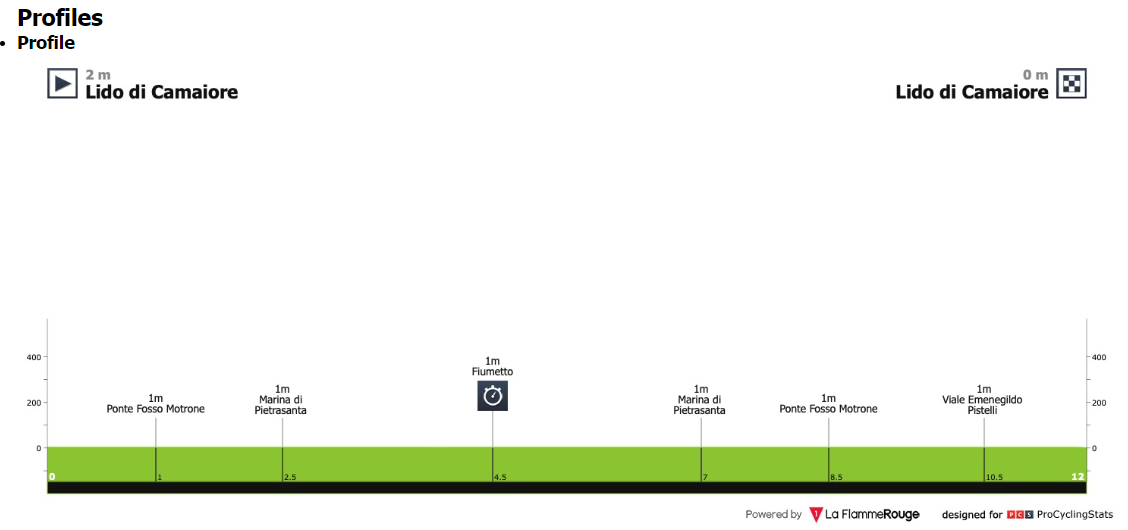 - A Tirreno-Adriatico egy 11,5 kilométeres egyéni időfutammal kezdődik. A sík pálya a Tirrén-tenger partján halad fel és le. A versenyzők Lido di Camaiore-ban gurulnak le a rajtrácsról, hogy északi irányba, Marina di Pietrasanta felé tolják neki nyélen, a fordulópont az 5. kilométernél van, és a versenyzők ugyanazon az egyenes úton haladnak végig, amelyen jöttek.