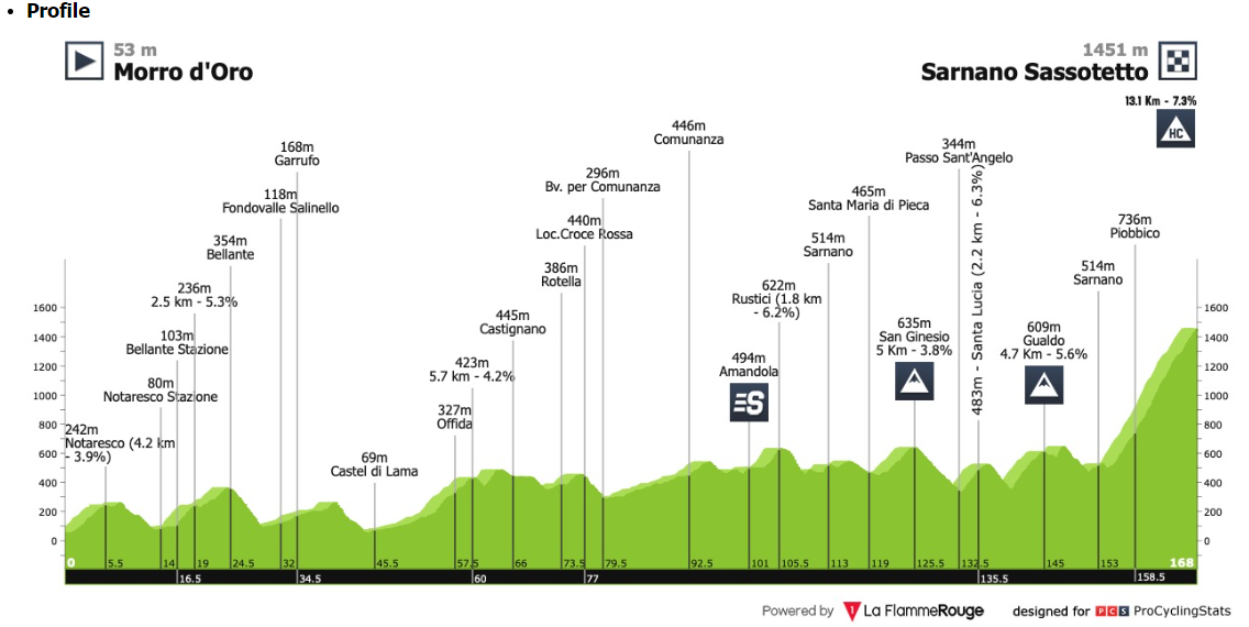 - A királyetap következik, nem hosszú ám annál nehezebb. Már az egész menet tele van kisebb-nagyobb emelkedőkkel, a végén pedig következik a HC-, vagyis kiemelt kategóriájú emelkedő, a Sarnano Sassotetto, amely 13,1 kilométer hosszan 7,3% átlagmeredekségű. Ez már igencsak combos lesz!