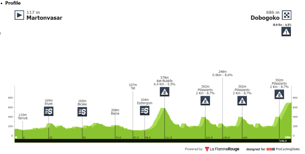- De jó kis mászókás szakasz volt tegnap Pécsett. Marc Hirschi fantasztikus támadással nyert a végén. Megérdemelt siker volt. Ma pedig a TDH királyszakasza következik, ahol végleg eldőlhet az összetett sorsa. Marc Hirschi vezet, majd a három brit tálentum következik Tulett, Poole, Onley, Bernal és Dina Márton is még elérhető távolságban van. Nagyon izgalmas hegyi szakasz következik. 206 kilométer, a 96-nál megkezdik a felkapaszkodást Dobogókőre Esztergom felől, de még nem mennek a csúcsra, a Két Bükkfa nyergen átbukva leszáguldanak Pilisszentkeresztig, majd a csobánkai elágazásik, és onnan egy hurkot tesznek és Pilisszántón keresztül kapaszkodnak fel ismét Pilisszentkeresztig. Itt található a kerékpáros berkekben csak Mészégetőnek nevezett emelkedő, ami szintén vetekszik a Mur de Huy nehézségével. Ezt a hurkot háromszor teszik meg, majd Pilisszentkereszten keresztül mennek a csúcsra, ahol hegyibefutó lesz! Érdemes megkóstolni Dobogókőn a vaddisznópörköltet, az út menti csárdában. Ott főzik nagy bográcsokban a hatféle ételkülönlegességet az út mellett.