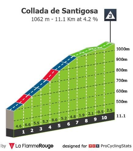 - Santigosa: 11,4 km, 4,1%, 471 méter szintkülönbség, 1059 méteren a csúcs