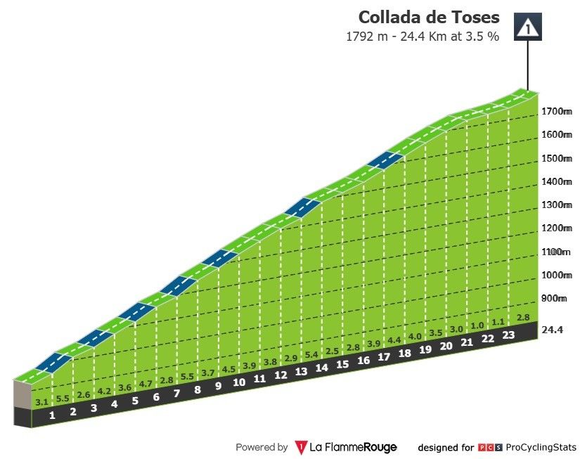 - Collada de Toses: 24,3 km, 3,5%, 869 méter szintkülönbség, 1790 m