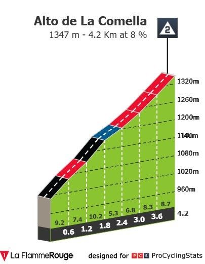 - La Comella: 4,2 km, 8%, 1347 m, az alján és a tetején is található 12%-os rész