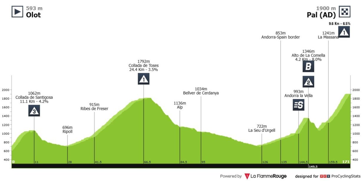 - Útvonal: Irány a Pireneusok, átlátogat a mezőny Andorrába is másfél nap erejéig, komoly hegyi befutó vár a mezőnyre. Mászással kezdenek, majd 17 kilométer lejtő és egy közel 25 kilis mászás. A hosszuk adja a nehézséget, a meredekség nem veszélyes. A Toses után mondhatni 60 kilométer lejtmenet vár, 1000 méternyit csökken a tengerszint feletti magasság. Innét jöhet az újabb mászás duóban, a La Comella rövid, de meredek, majd a hegyi befutó Pal településnél lesz, 1901 méter magasan. Összesen 3475 méter szintkülönbség a nap folyamán. Az utolsó emelkedő feléhez közeledve van egy átlag 9,5%-os rész, ez a legdurvább szakasza, viszont a célhoz közeledve többször is találkozni fognak a bringások 10-12%-os pontokkal.