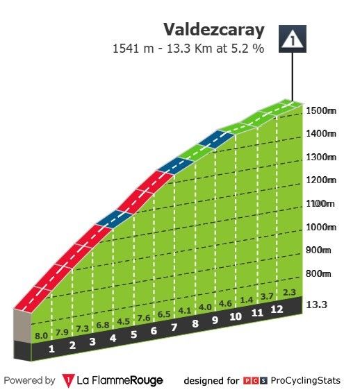 Emelkedők: A Valdezcaray 13,4 km hosszú, átlag 5%-on, 1523 méteren a csúcs. A képen is látható, a hegy első fele lesz a keményebb, van 12%-os része is.