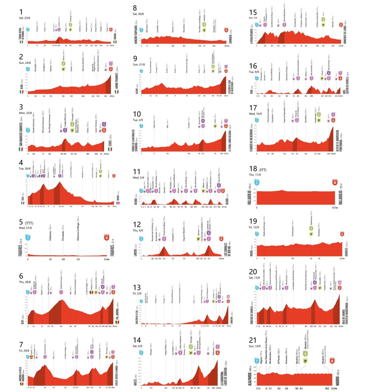 - Olaszországi rajt, majd Franciaország, Andorra az extra helyszínek és természetesen Spanyolország a központ a 21 szakasz során. 2 időfutam vár a mezőnyre, ebből az egyik csapatidőfutam, 4-5 mezőnyhajrá, 10 hegyibefutó az útvonalon. Terítéken az ikonikus Angliru, szóval izgalmakban nem lesz hiány.