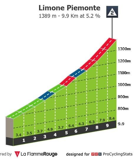 Emelkedők: A Limone Piemonte második kategóriás emelkedő. Kezdődik megint a harcom a számadatokkal és a ProCycling szidással, mert picit máshogy mérnek, mint a "hivatalosabb" oldalak, miközben a ProCycling is egy csúcs weboldal. Ahogy közelednek a csúcshoz úgy nő a meredekség is, hosszú mászás lesz, az átlagmeredekség még baráti.