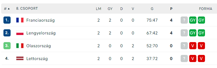 - A francia válogatott a csoport favoritja az Európa-bajnoki selejtezőben. Az első mérkőzéseken óriási fölényben volt Olaszország és Lettország ellen, kétszámjegyű különbséggel nyert. A csapat a januári világbajnokságon döntős lett. A tornán vereség nélkül jutott tovább, a döntőben pedig 29:34 arányban kikapott Dániától. Ma biztosan nem lesznek olyannyira élesek, mint a VB-döntőben, de azért egy ilyen topcsapattól gyenge formát sem szabad soha várni!