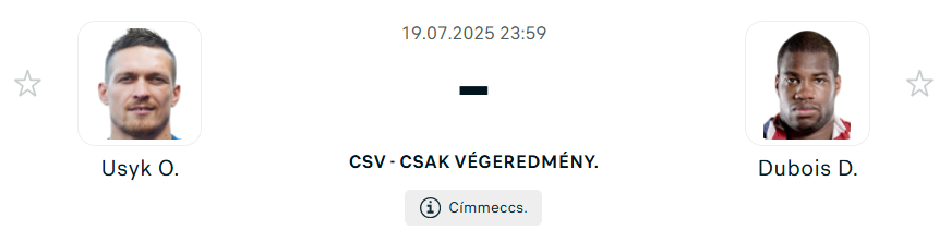 - Dubois az IBF világbajnoka, Uszik pedig a WBO, WBA, WBC öveit vonultatja majd fel a mérkőzést megelőzően. Történelmi lehetőség előtt áll mindkét bunyós, hiszen amióta 4 világszervezet van, csak egyszer sikerült minden övet egy bokszolónak viselnie (valamint a Ring Magazinét is), az pedig éppen Uszik volt, miután először legyőzte Tyson Fury-t.