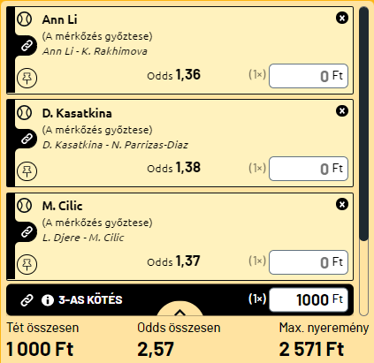 Minden napra kiválasztok egy szelvényt is, amelyet az aktuális napi kínálatból szemezgetek össze. Ez már itt lehet ATP-verseny és Challenger torna is, valamint lesz olyan is, hogy női meccs is bekerül. Várom az olvasókat is, hogy írják bele, ők kiket raknának össze!