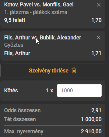- P. Kotov – G. Monfils: Kotovban van erő, de nem nyűgöz le alapvonalas püfölős játéka. Mentálisan is jó, van türelme, de technikai téren középszint. Monfils ezen a téren sokkal cizelláltabb teniszező. Ő az elődöntőben szintén a Kotov-hoz hasonló alapvonalas darálós játékban erős Györe Lacival meccselt és 7-5, 6-2-re megverte a vajdasági magyar fiút. Kotov sokkal erőteljesebb, keményebb és nagyobb ütőerővel rendelkező játékos, mint Djere és Monfils nem fiatal már. Az első szettet mindenképpen szorosnak várom, aztán minden attól függ, hogy bírja majd a francia. Jó tipp lehet az over. Tipp: Első játszma, játékok száma 9,5 felett – 1,70